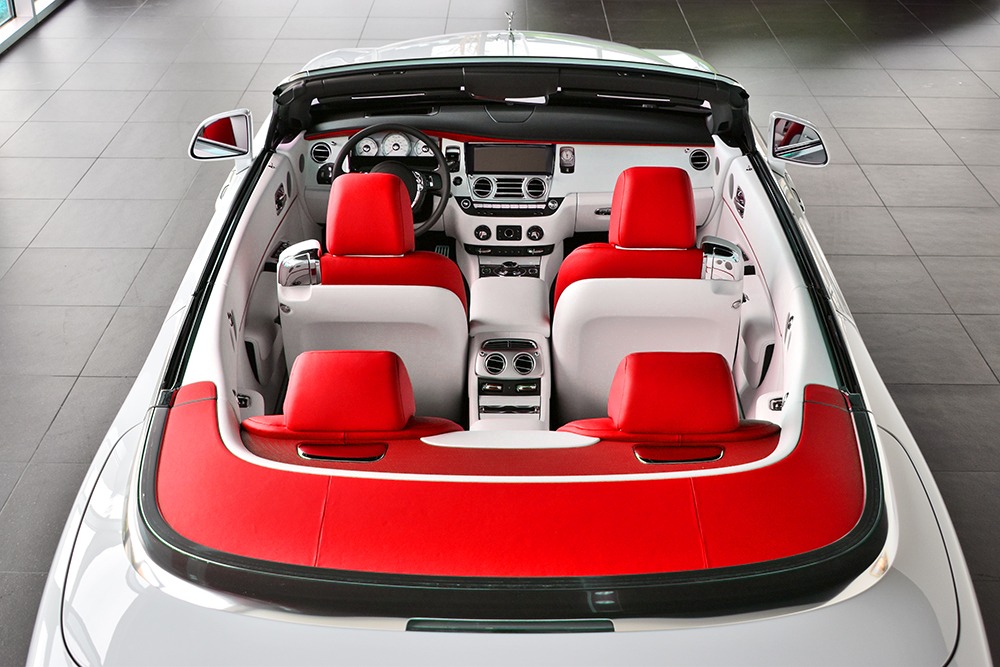 A breathtaking blend of refined craftsmanship and performance, the Rolls‑Royce Dawn is a full‑size luxury grand tourer with a whisper‑quiet soft-top convertible roof. The example pictured elevates the classic design with bold red interior accents and custom wheels, offering a blend of opulence and personalization.